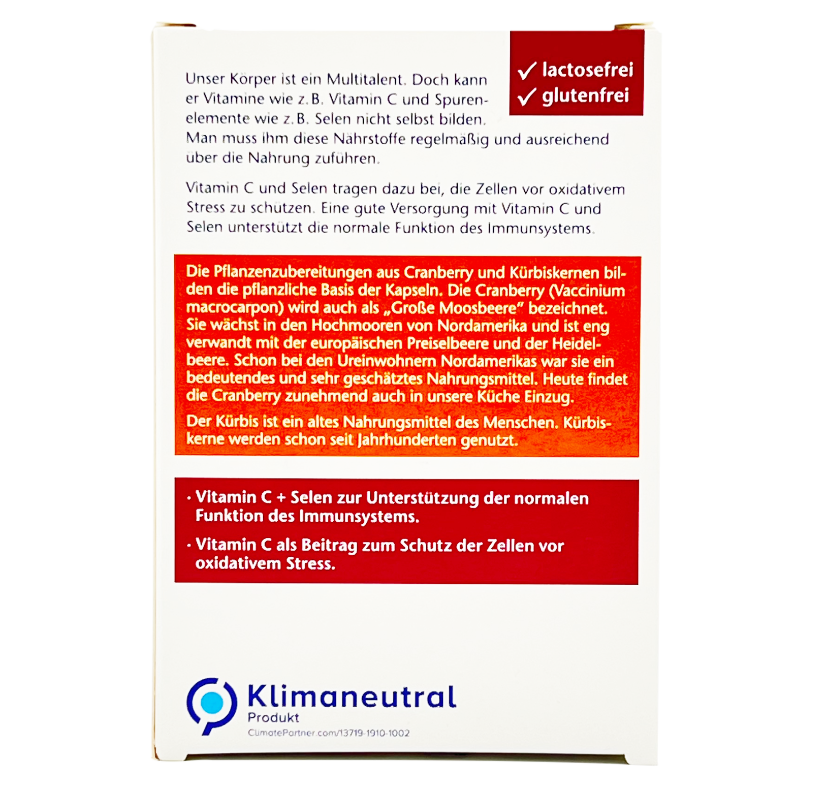 Unser Körper ist ein Multitalent. Doch kann er Vitamine wie Vitamin C und Spurenelemente wie Selen nicht selbst bilden. Man muss ihm diese Nährstoffe regelmäßig und ausreichend über die Nahrung zuführen. Vitamin C und Selen tragen dazu bei, die Zellen vor oxidativem Stress zu schützen. Eine gute Versorgung mit Vitamin C und Selen unterstützt die normale Funktion des Immunsystems. Die Pflanzenzubereitungen aus Cranberry und Kürbiskernen bilden die pflanzliche Basis der Kapseln. Die Cranberry (Vaccinium macrocarpon) wird auch als „Große Moosbeere“ bezeichnet. Sie wächst in den Hochmooren von Nordamerika und ist eng verwandt mit der europäischen Preiselbeere und der Heidelbeere. Schon bei den Ureinwohnern Nordamerikas war sie ein bedeutendes und sehr geschätztes Nahrungsmittel. Heute findet die Cranberry zunehmend auch in unsere Küche Einzug. Der Kürbis ist ein altes Nahrungsmittel des Menschen. Kürbiskerne werden schon seit Jahrhunderten genutzt. Vitamin C + Selen tragen zur normalen Funktion des Immunsystems bei, Vitamin C leistet einen Beitrag zum Schutz der Zellen vor oxidativem Stress.
