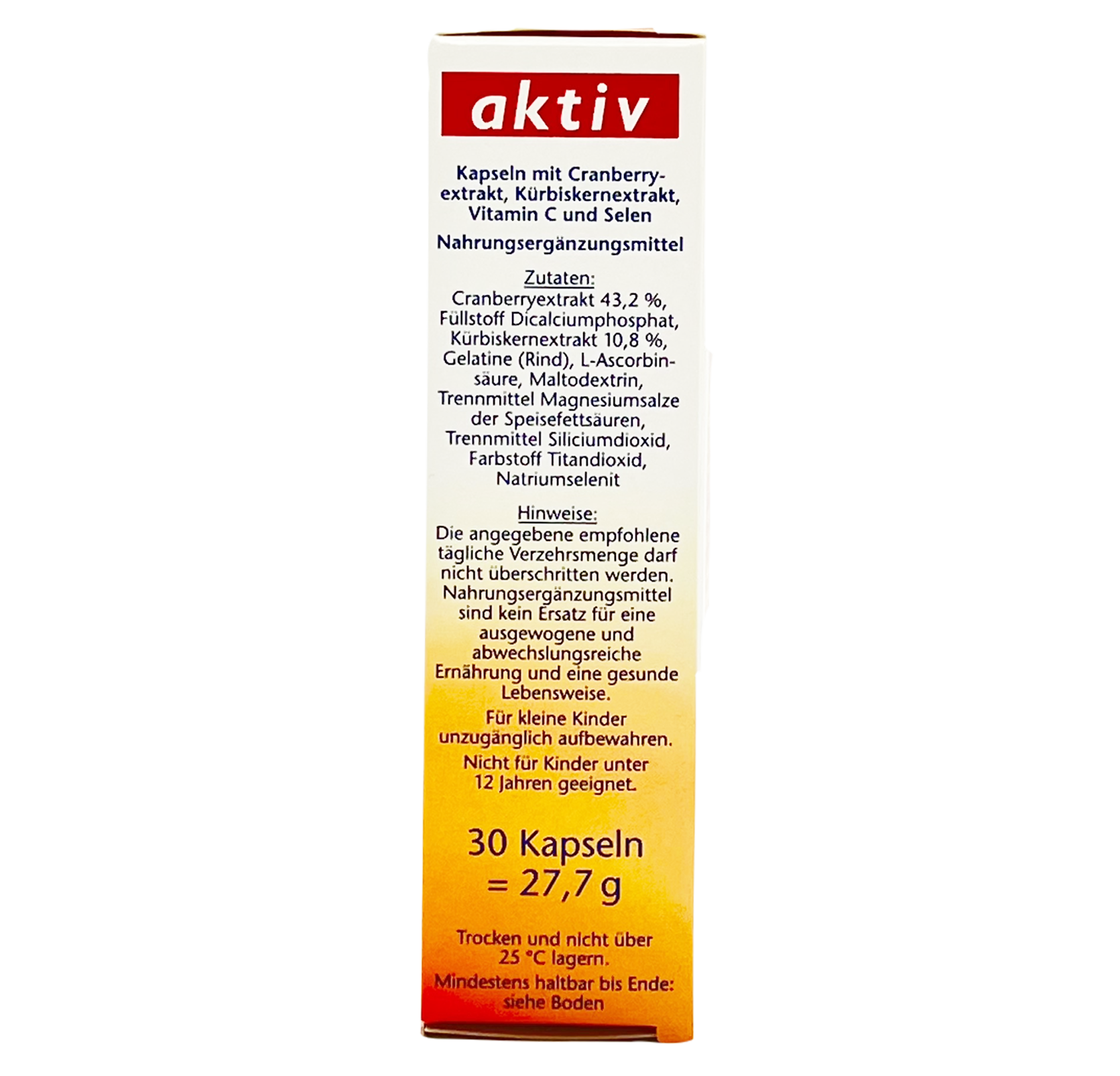 Cranberryextrakt, Füllstoff Dicalciumphosphat, Gelatine (Rind), Kürbiskernextrakt, L-Ascorbinsäure (Vitamin C), Maltodextrin, Trennmittel Magnesiumsalze der Speisefettsäuren, Trennmittel Siliciumdioxid, Farbstoffe Eisenoxide und Eisenhydroxide, NatriumselenitAnwendungstipps/Dosierung