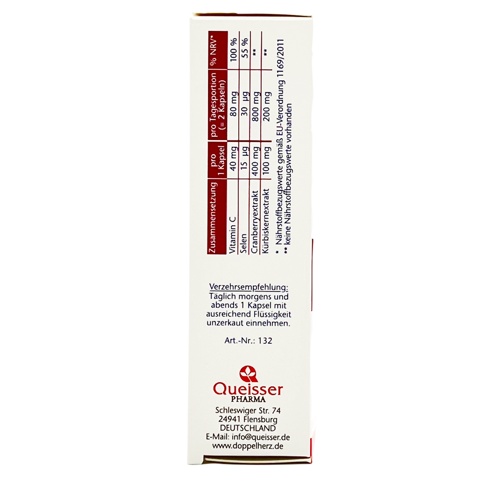 Bei Doppelherz Cranberry + Kürbis + Vitamin C + Selen handelt es sich um Kapseln von Queisser Pharma GmbH & Co. KG.
