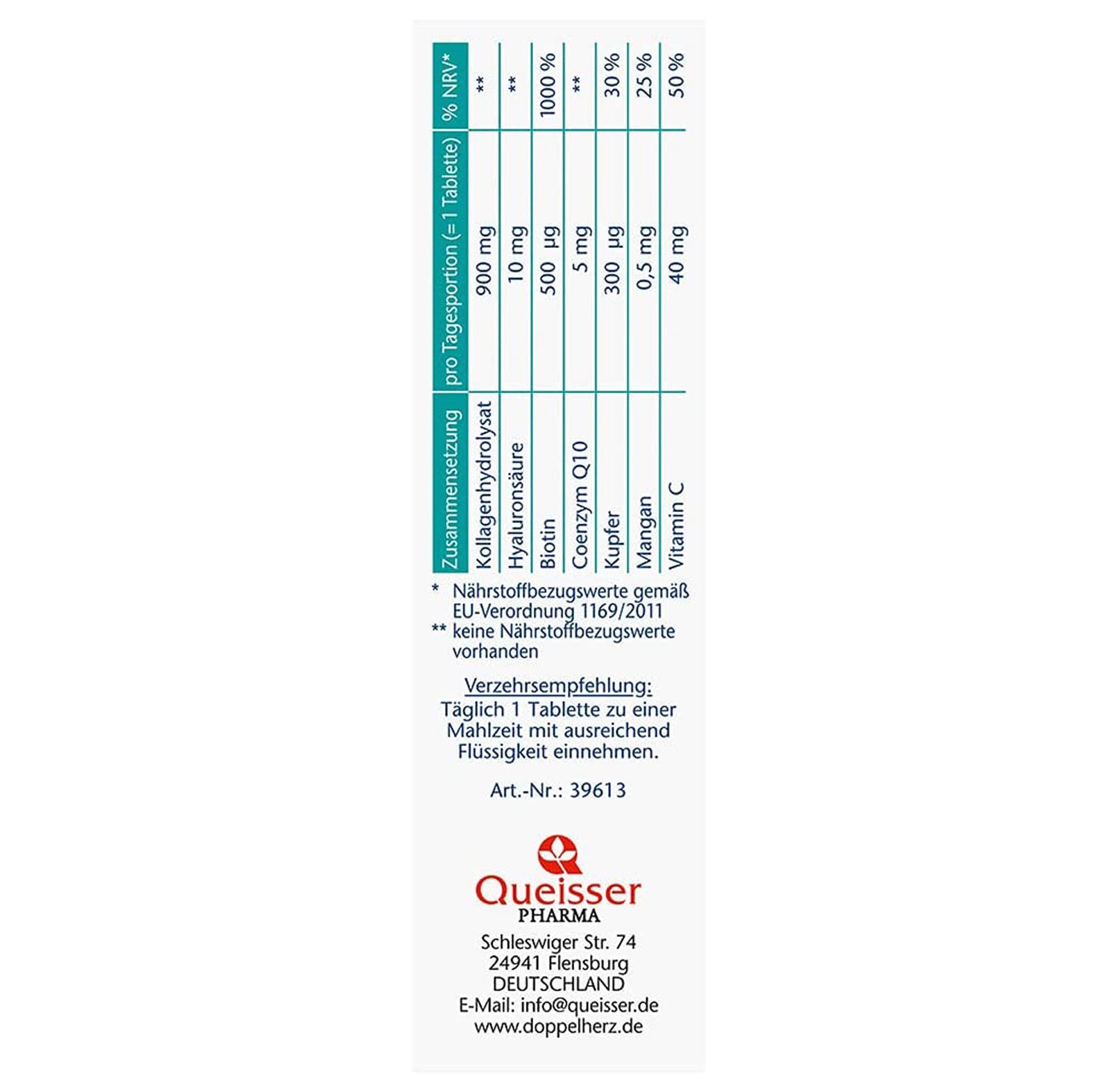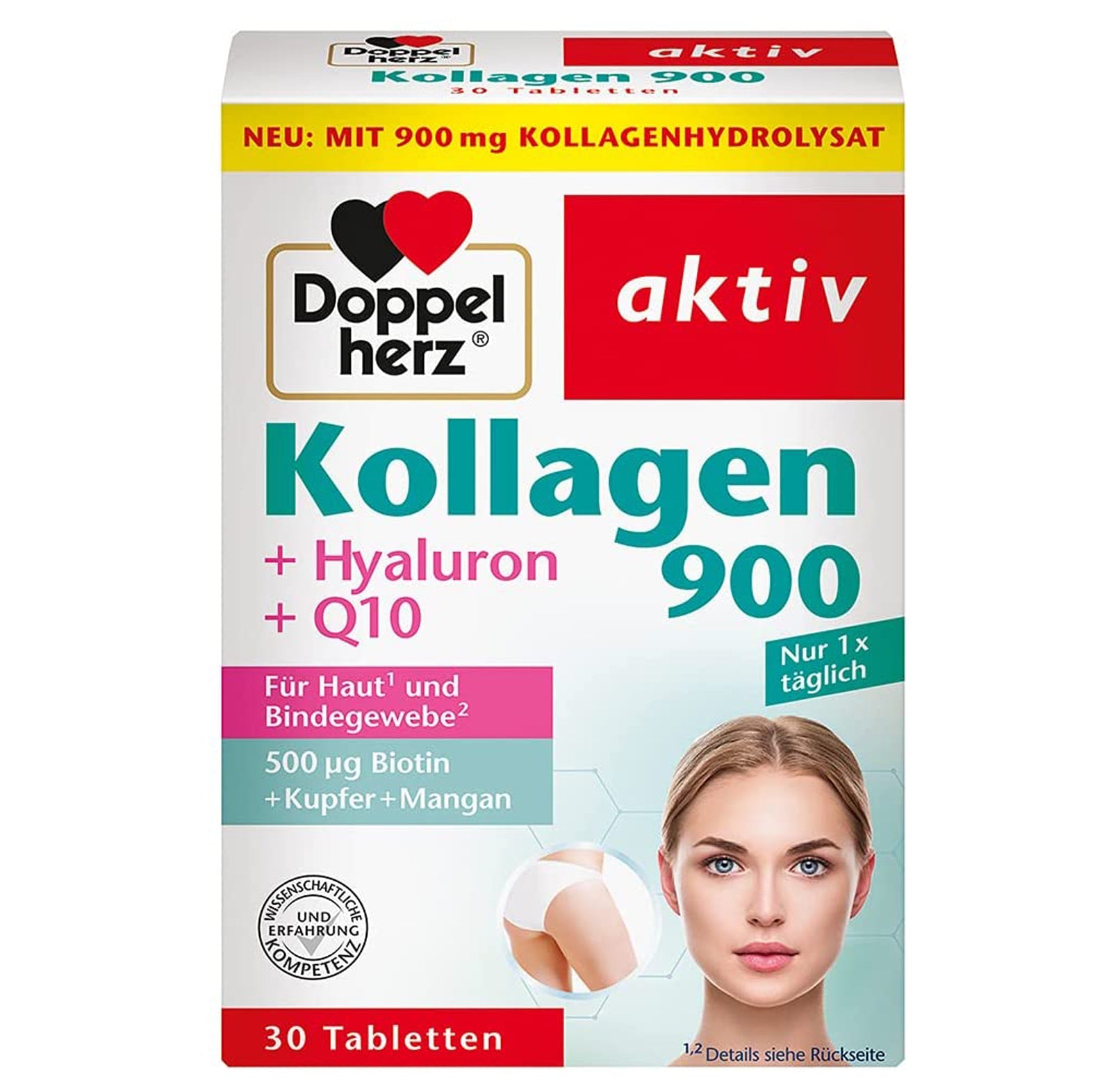 Die Tabletten von Doppelherz Kollagen 900 enthalten 900 mg Kollagenhydrolysat plus 10 mg Hyaluronsäure, in Kombination mit den Vitaminen C und Biotin sowie den Spurenelementen Kupfer und Mangan. Zusätzlich enthalten ist Coenzym Q10.
