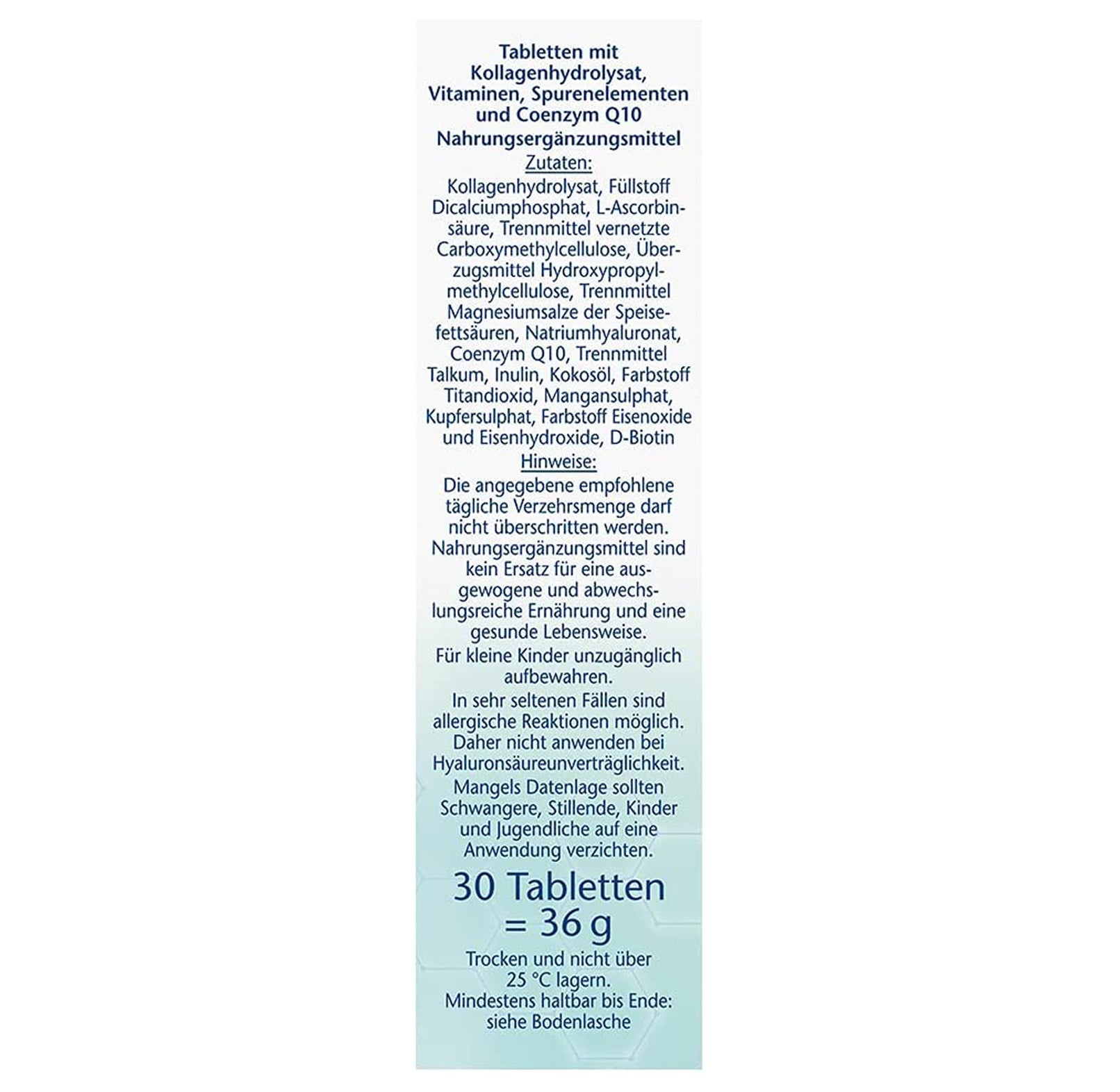 Kollagenhydrolysat, Füllstoff Dicalciumphosphat, L-Ascorbinsäure (Vitamin C), Trennmittel vernetzte Carboxymethylcellulose, Überzugsmittel Hydroxpropylmethylcellulose, Trennmittel Magnesiumsalze der Speisefettsäuren, Natriumhyaluronat, Coenzym Q10, Trennmittel Talkum, Inulin, Kokosöl, Farbstoff Titandioxid, Mangansulphat, Kupfersulphat, Farbstoff Eisenoxide und Eisenhydroxide, D-Biotin